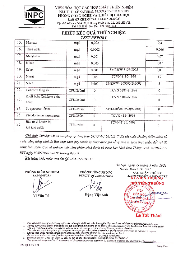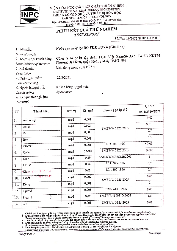 Phiếu kết quả thử nghiệm chất lượng nước đạt tiêu chuẩn QCVN6-1:2010/BYT của nước qua máy lọc RO FUJI POVA (gia đình)
